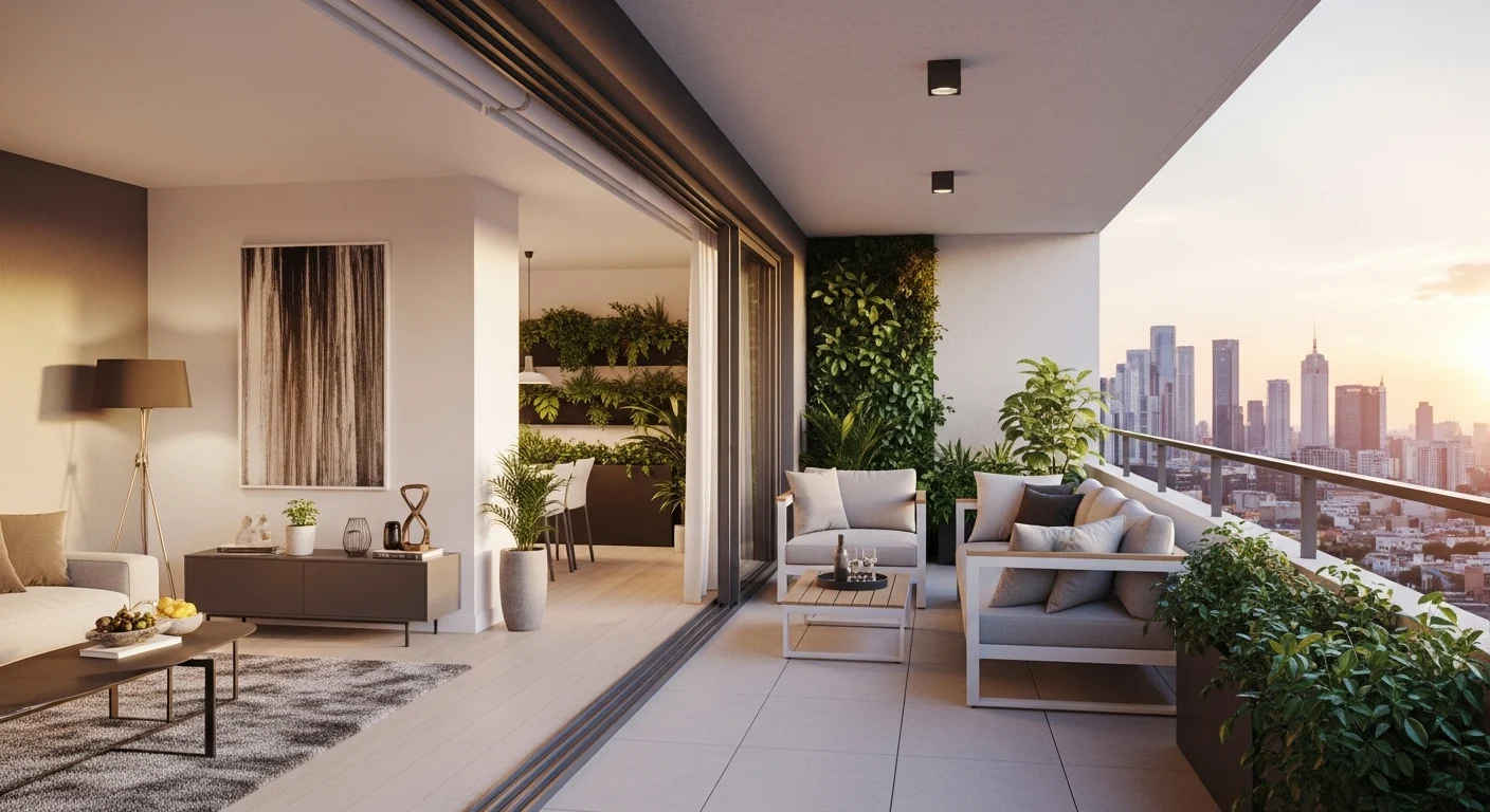 Balcony integration expands living space visually. Large doors bring natural light inside. Outdoor seating extends relaxation area. Apartments feel airy and fresh. Plants enhance connection with nature. The home feels larger.