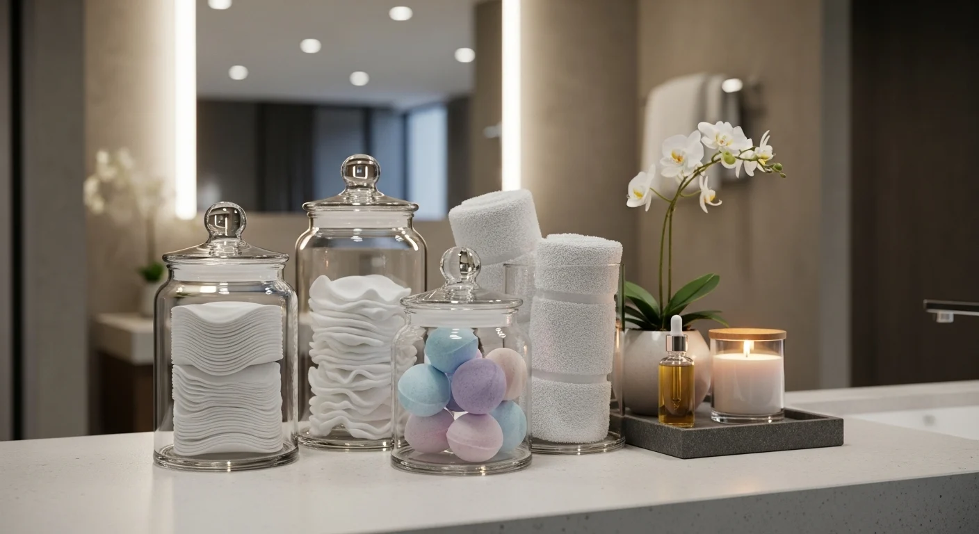 Glass jars add elegance while storing cotton pads, bath salts, or accessories.
