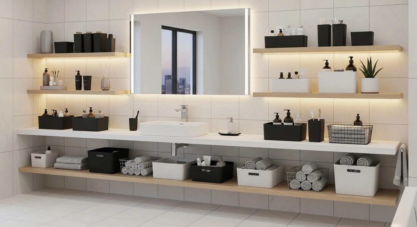Floating shelves keep essentials accessible without taking floor space. They create a clean, modern look while adding storage above sinks or toilets.