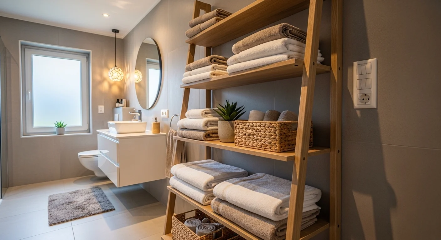 A ladder shelf adds storage while acting as decor. Perfect for towels and baskets.