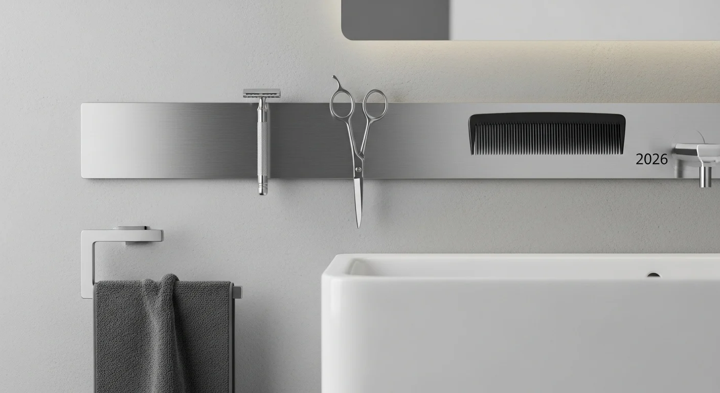 Magnetic strips hold metal grooming tools like tweezers or nail clippers.