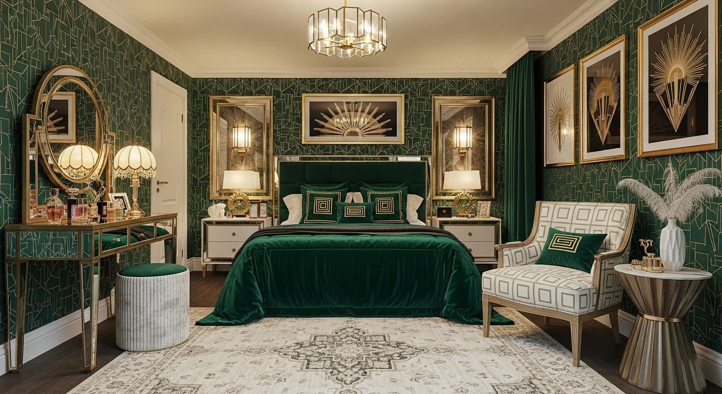 Art Deco bedrooms feature geometric patterns, metallic accents, and luxurious fabrics. Jewel tones and velvet add sophistication. 2026 trends balance glamour with comfort. Statement mirrors or lighting act as focal points. Symmetry and bold shapes define the aesthetic.