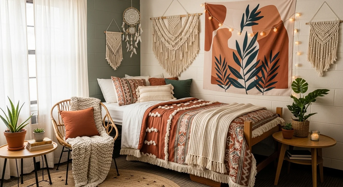 Macramé and woven decor add interest. Soft lighting enhances warmth. Plants bring freshness. Boho spaces feel lived-in. This style avoids rigidity. Dorm rooms feel welcoming and stylish.