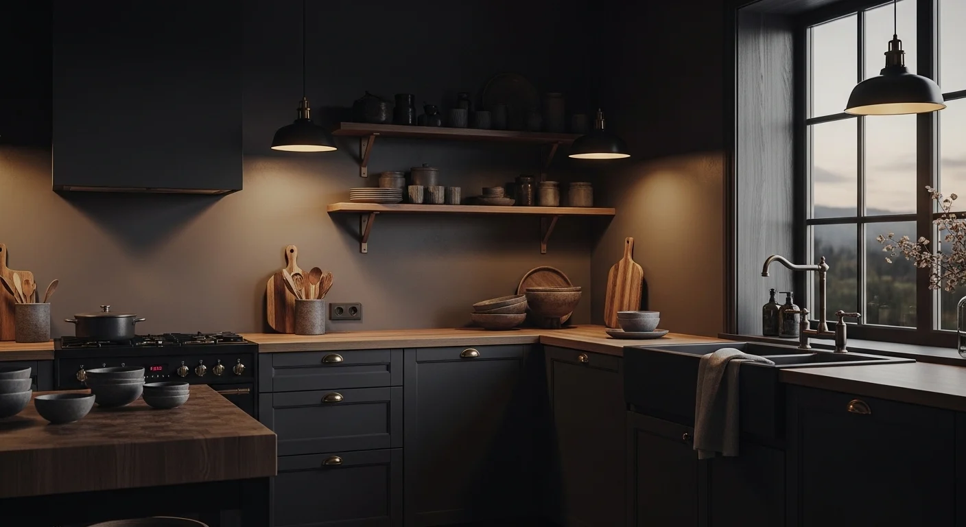 Dark kitchens can still feel cozy when balanced with warm lights and wood accents. Charcoal or deep brown cabinets create intimacy and luxury.