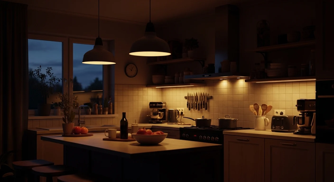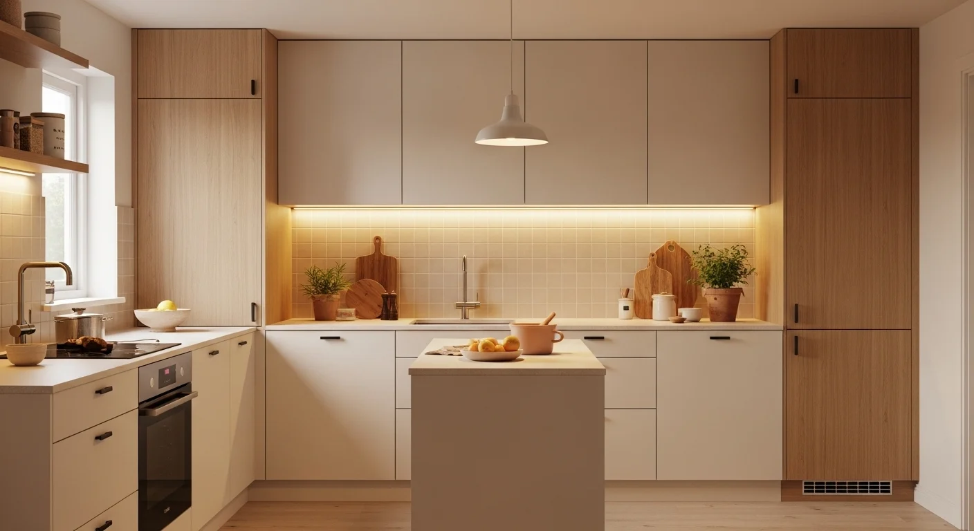 Lighting plays a major role in coziness. Instead of harsh ceiling lights, layered lighting using under-cabinet LEDs, pendant lights, and warm bulbs creates depth. Soft illumination reduces visual stress and makes evening cooking feel relaxing and intimate.
