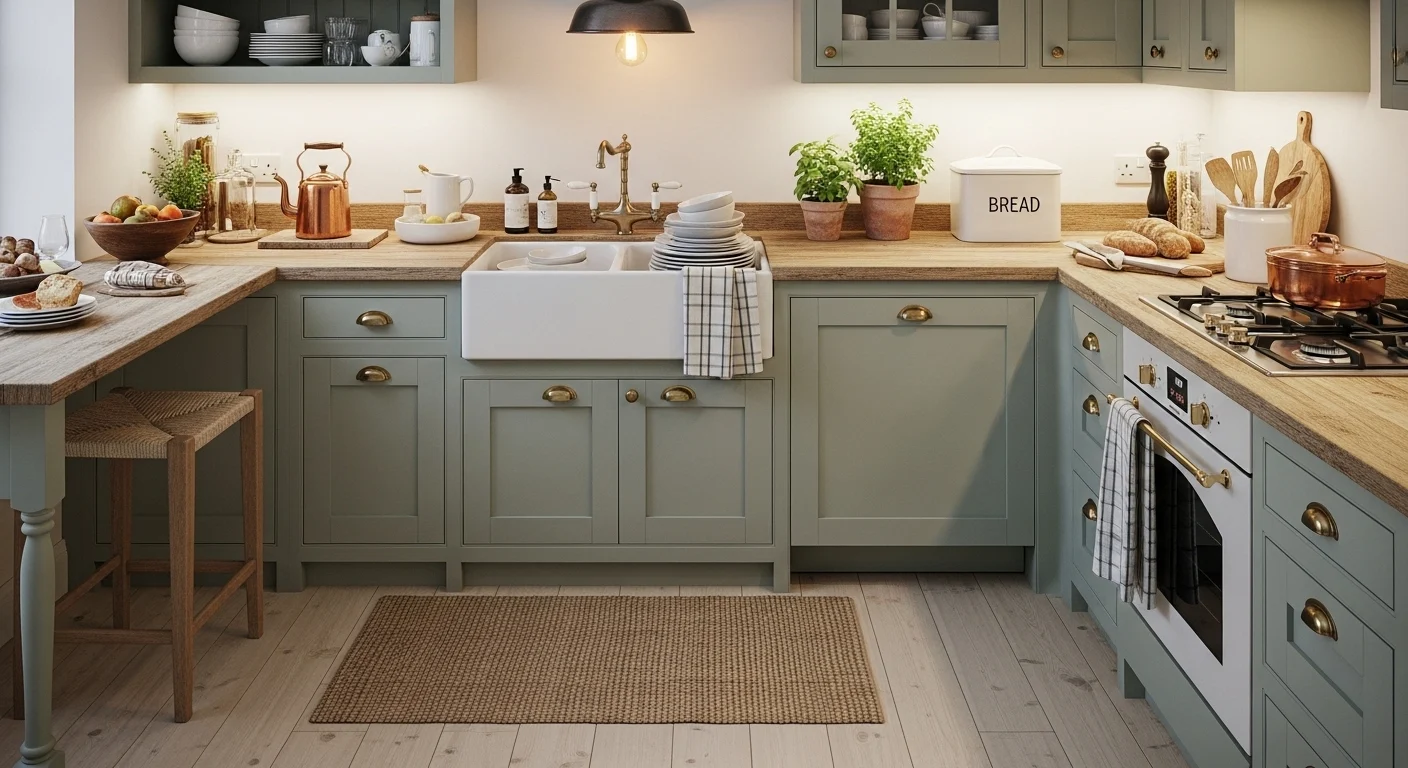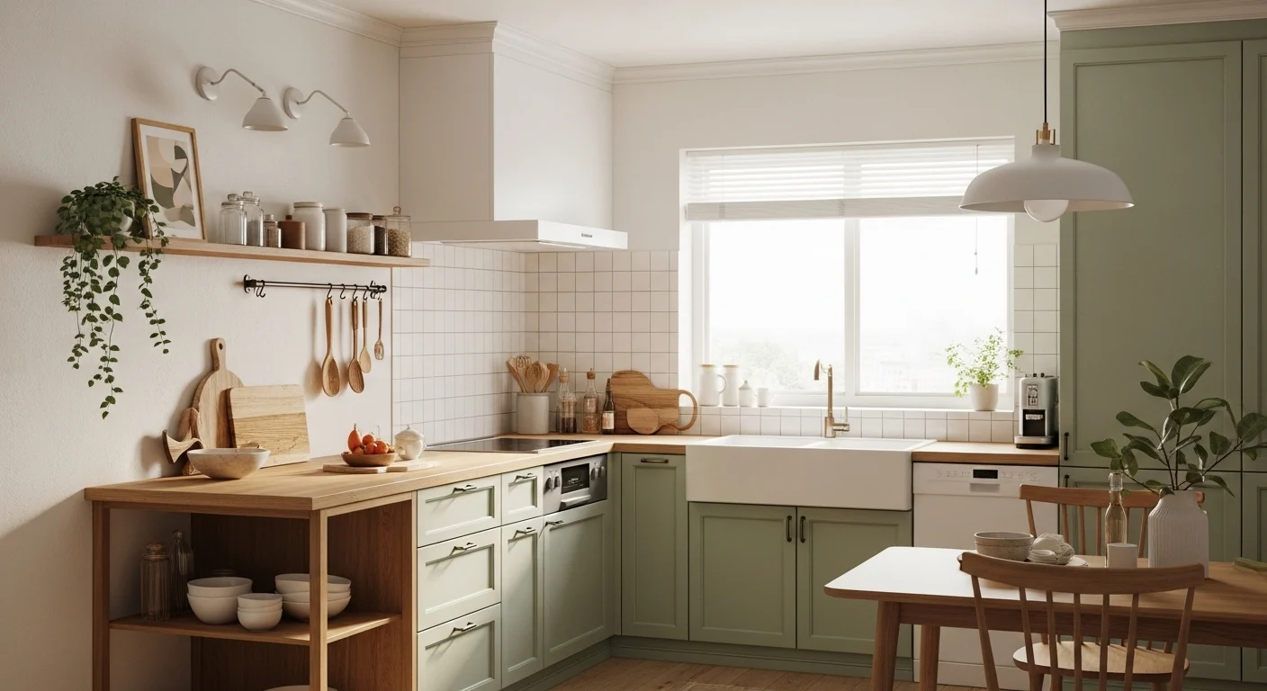 Muted green cabinets create calmness and connect interiors with nature. Sage and olive shades are especially popular for cozy kitchens in 2026.