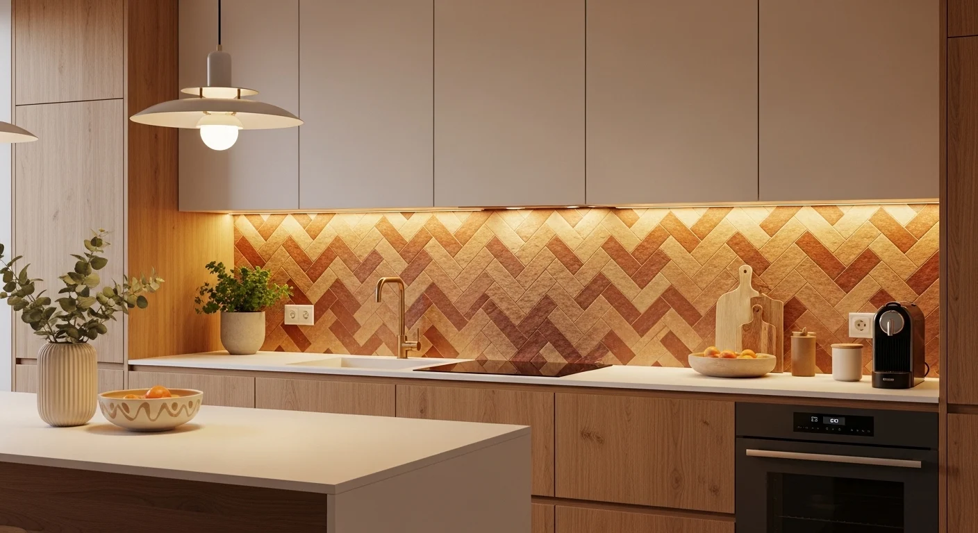 A textured backsplash such as handmade tiles or stone adds visual warmth. Texture reflects light differently, preventing the kitchen from looking flat. Neutral textured tiles are trending strongly in 2026 interiors.