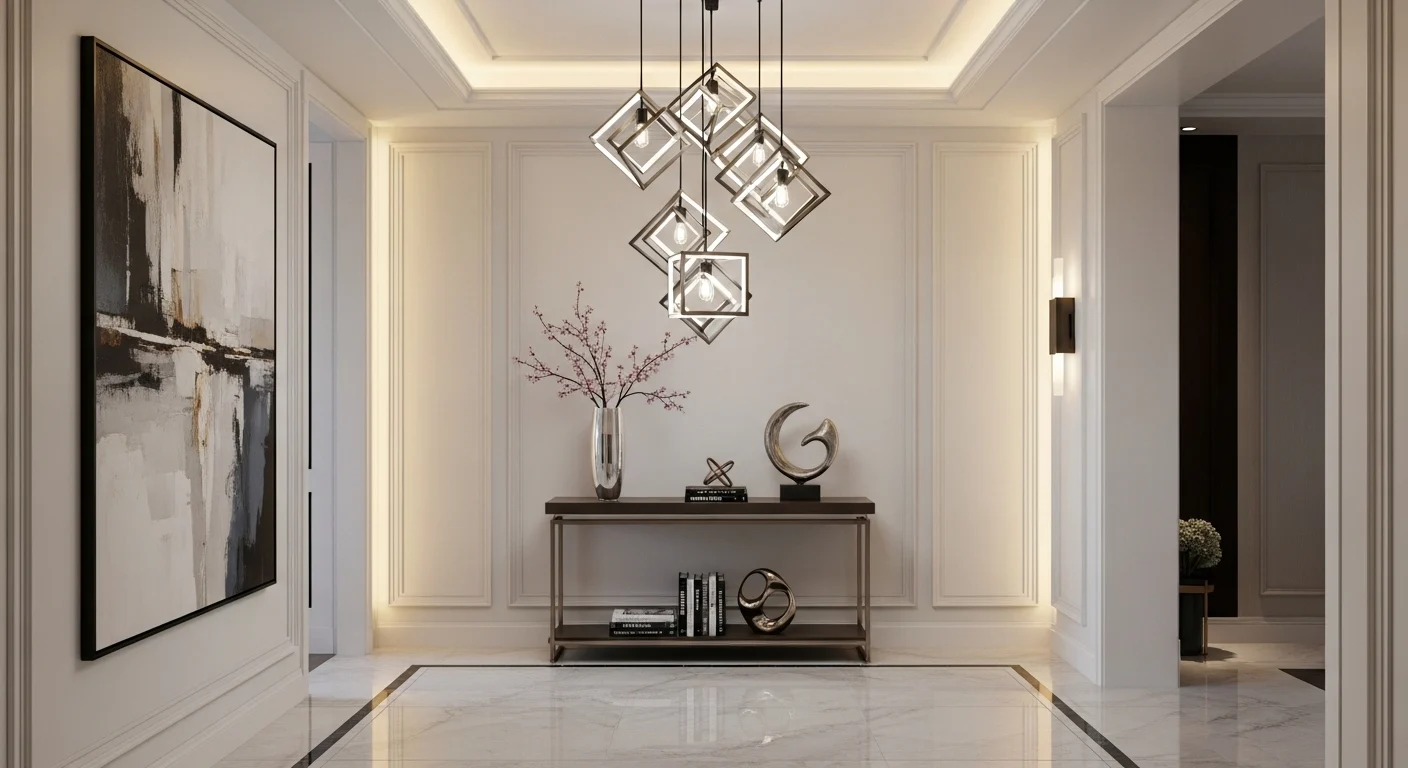 Hotel-inspired entrances feel premium. Symmetry and lighting define this style. Elegant consoles and mirrors dominate. Neutral palettes keep sophistication. Soft lighting enhances mood. It feels upscale.