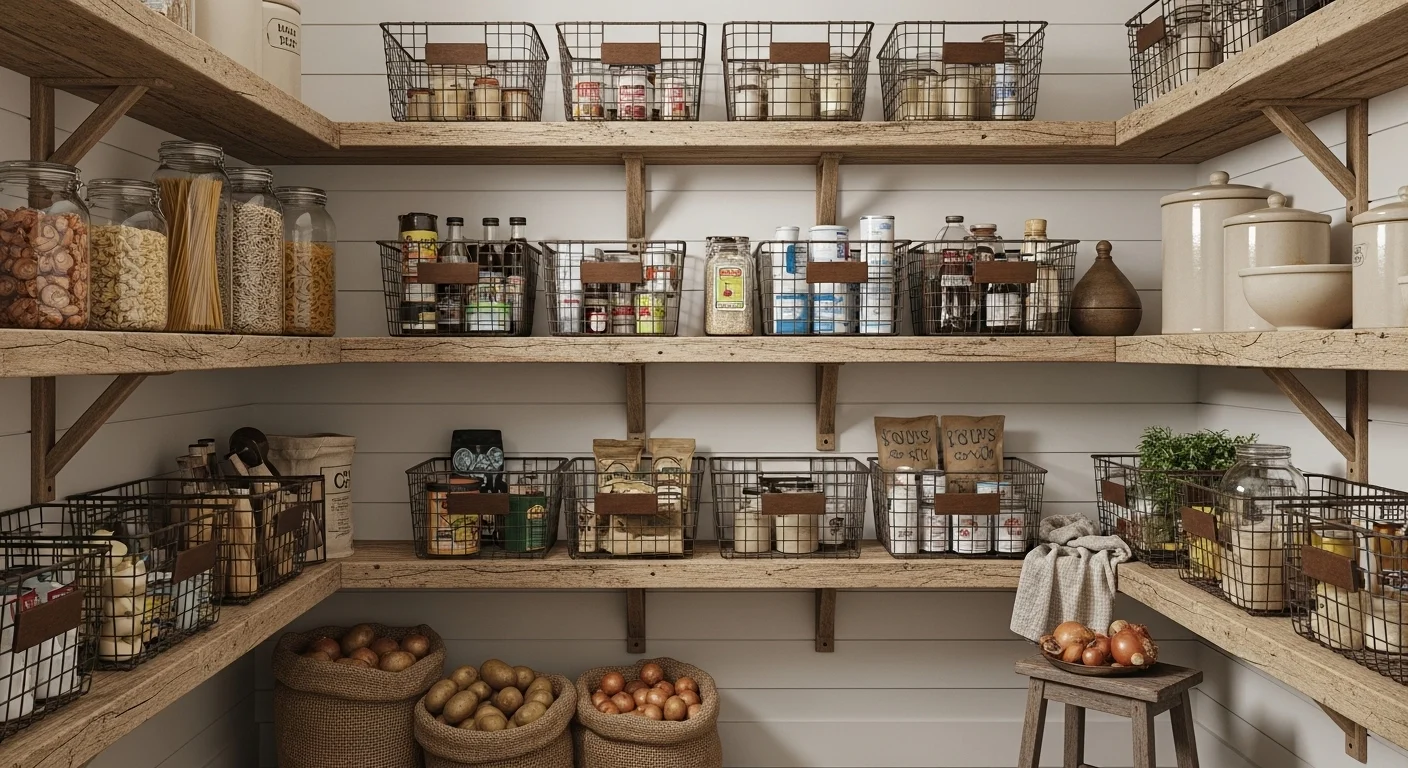 19. Farmhouse Pantry with Wire Baskets