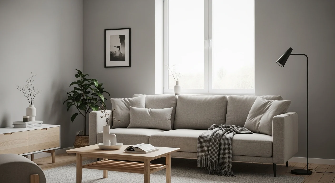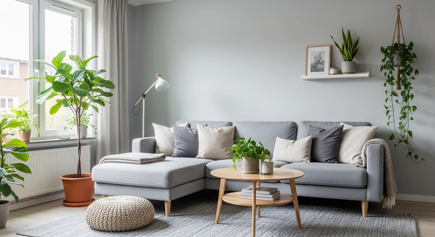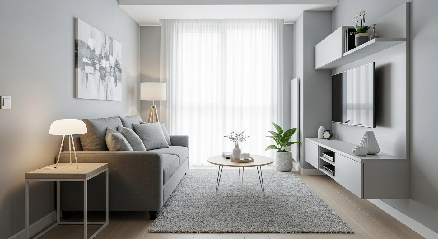 Light gray tones help visually expand compact living rooms by reflecting light and reducing visual clutter. Smart furniture choices keep the space functional without feeling crowded.