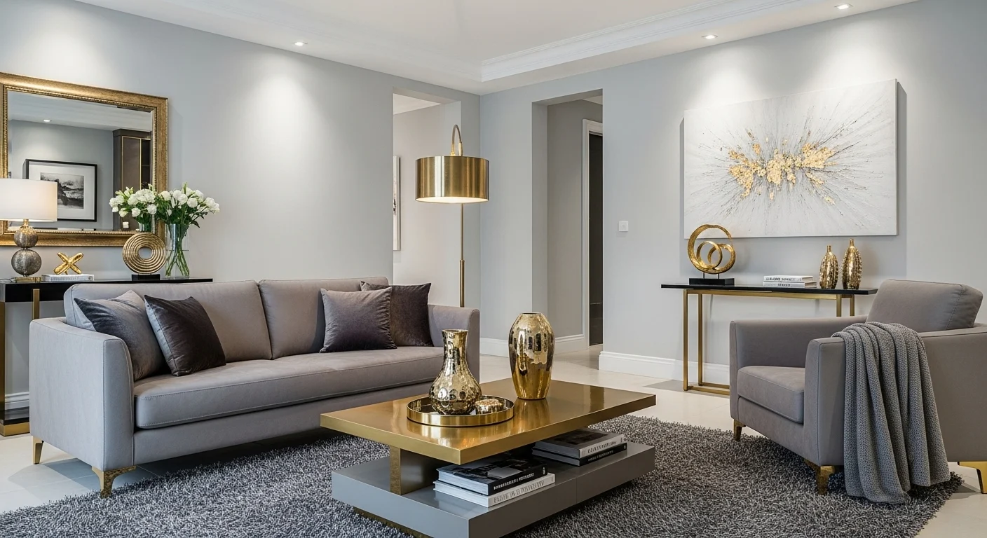 Metallic finishes like brass, chrome, or gold elevate gray interiors instantly. Small accents such as tables, lamps, or décor pieces add sophistication while maintaining balance.