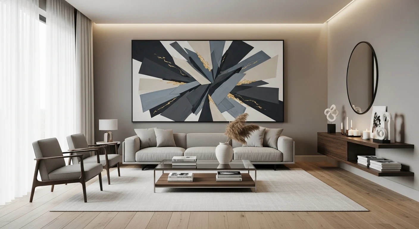 Large artwork brings personality into a neutral gray setting. Bold art pieces create contrast while keeping the base palette calm and balanced.
