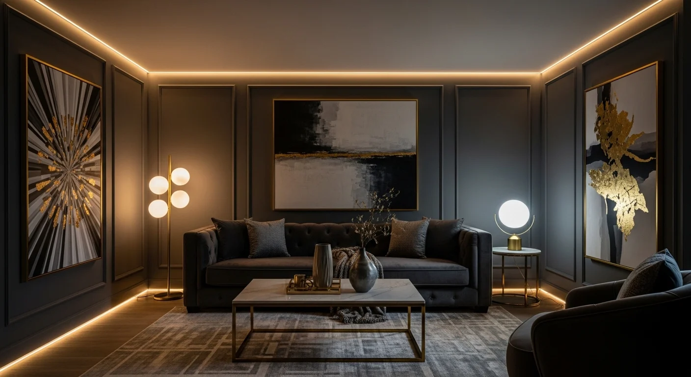 Dark gray tones instantly add drama and sophistication to a living room. When paired with warm lighting, velvet textures, or metallic accents, the space feels luxurious rather than heavy. This design is perfect for creating a cozy evening atmosphere while maintaining a high-end modern look. Layered lighting prevents the room from feeling too dark.