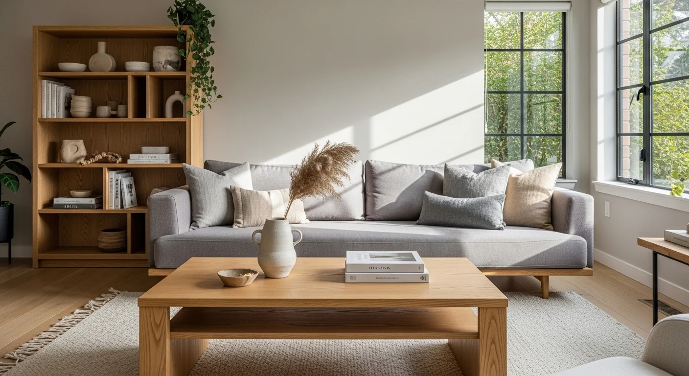 4. Warm Gray Living Room with Wood Accents