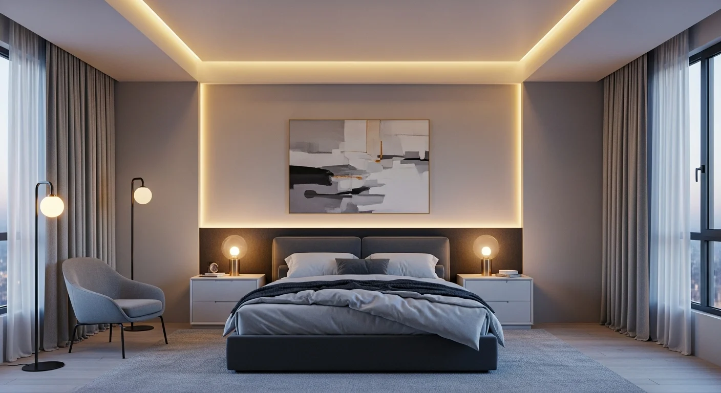 Lighting transforms grey tones. Soft ambient lights enhance warmth. The bedroom feels relaxing at night. Perfect for mood-driven interiors.