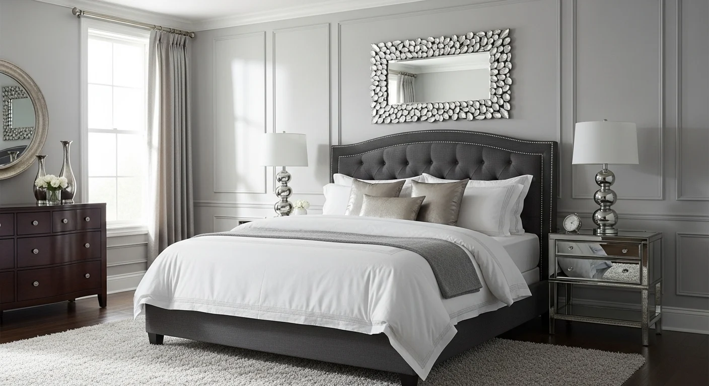 Metallic accents elevate grey bedrooms. Brass or chrome adds shine. The contrast feels elegant. Best used sparingly.