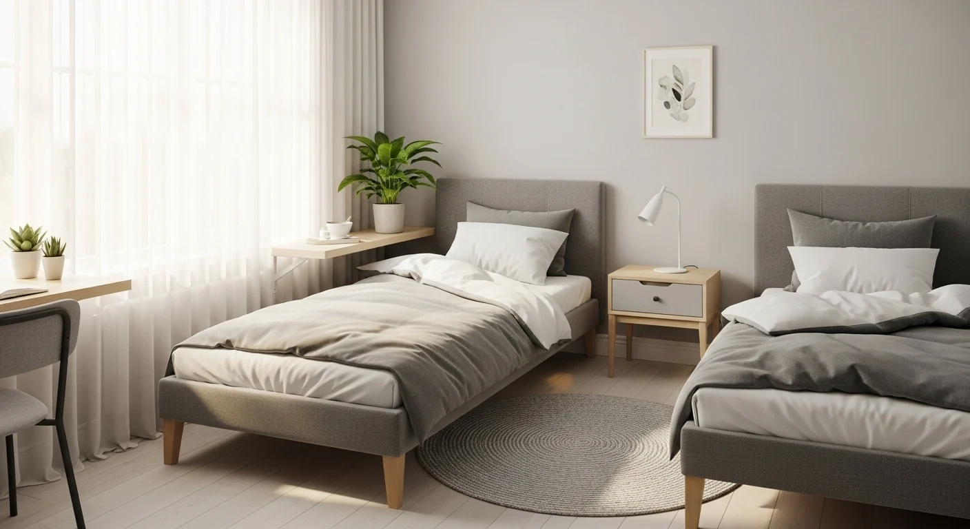Grey works well in small bedrooms. Light shades keep it open. Smart furniture saves space. The room feels balanced and modern.