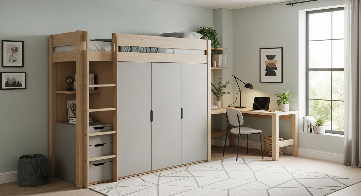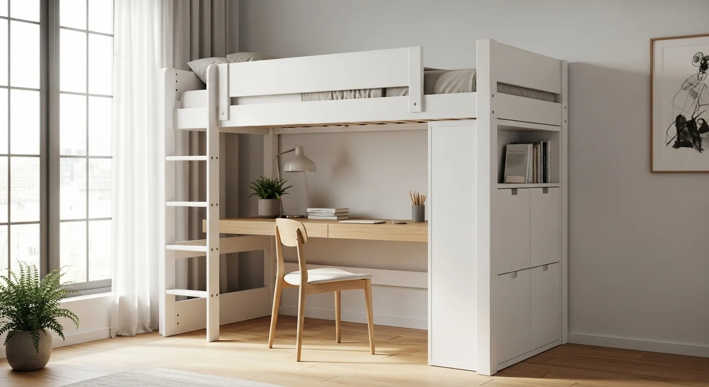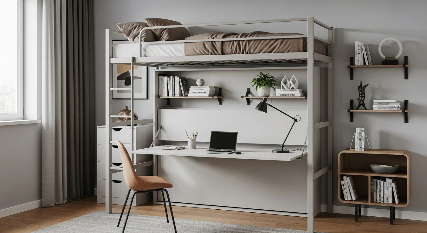 A foldable desk under a loft bed combines sleeping and working space efficiently. Great for home offices or student rooms in 2026.