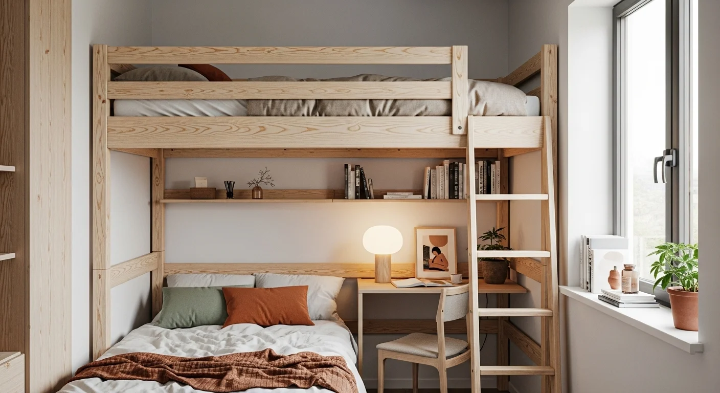 A bunk-style loft bed is ideal for shared rooms. The elevated design allows for multiple sleeping areas without sacrificing floor space.