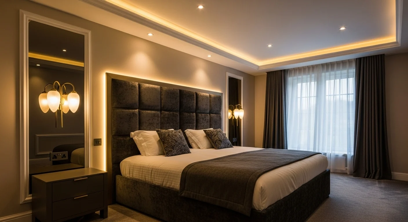 Lighting is a major design element in 2026 luxury bedrooms. Hidden LED strips, wall sconces, and layered lighting create a soft glow that enhances mood and comfort. Harsh overhead lights are avoided in favor of ambiance.