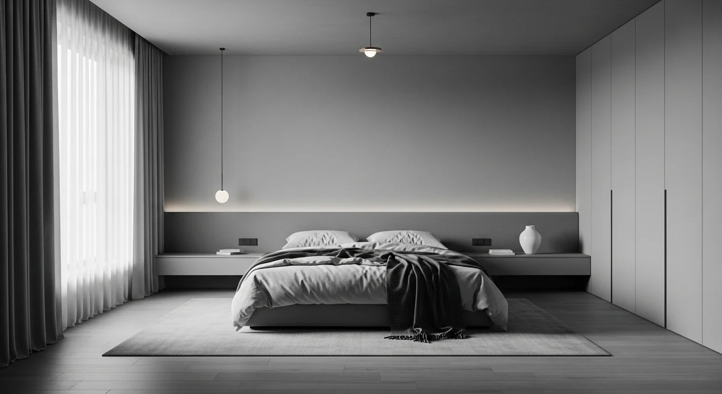 Minimalist bedroom using layered grey tones to create a calm and cohesive interior
