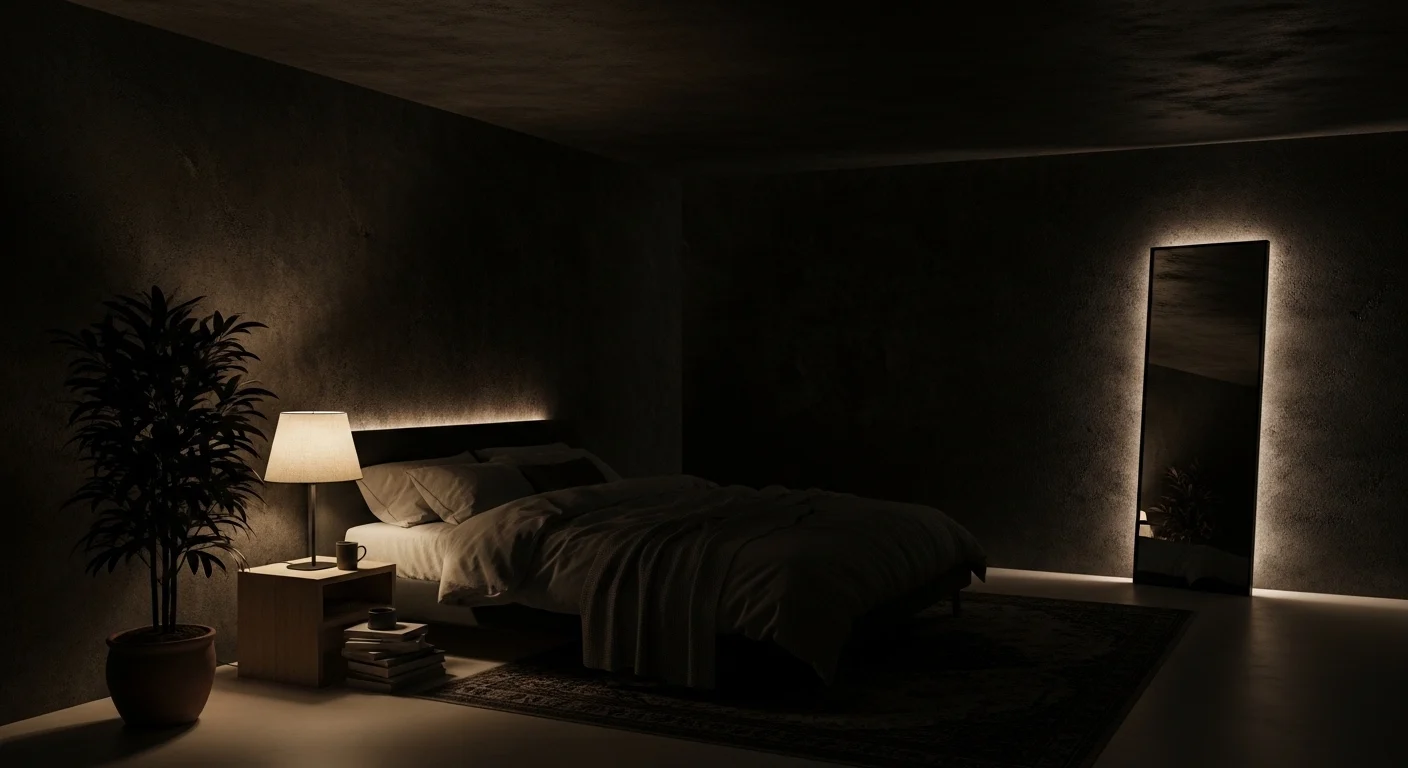 Shadows create visual layers. Soft lamps shape space. Textures catch light subtly. Walls feel alive. Lighting enhances atmosphere. The bedroom feels cinematic.