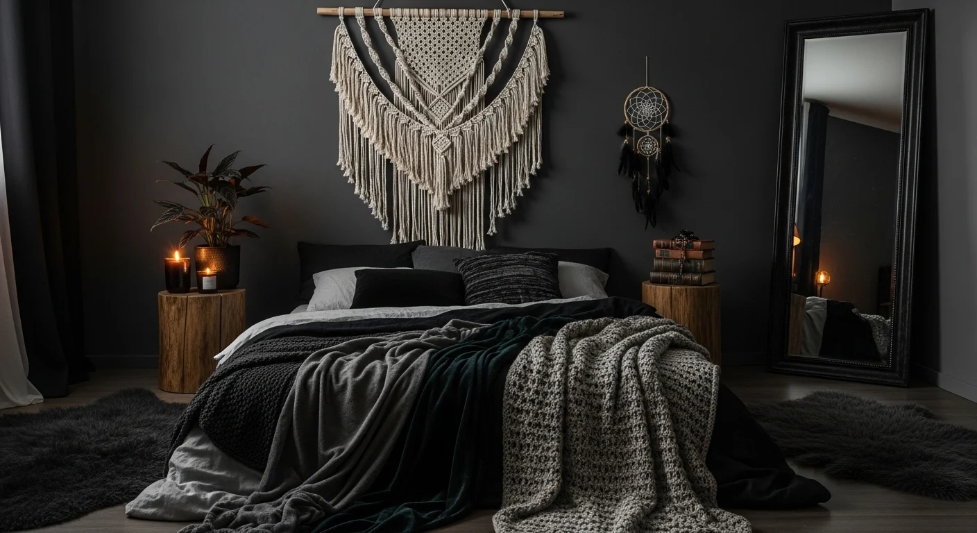 Macramé and rugs add warmth. Plants soften darkness. Soft lighting enhances mood. Mixed textures add depth. Neutral bedding balances look. The bedroom feels inviting.