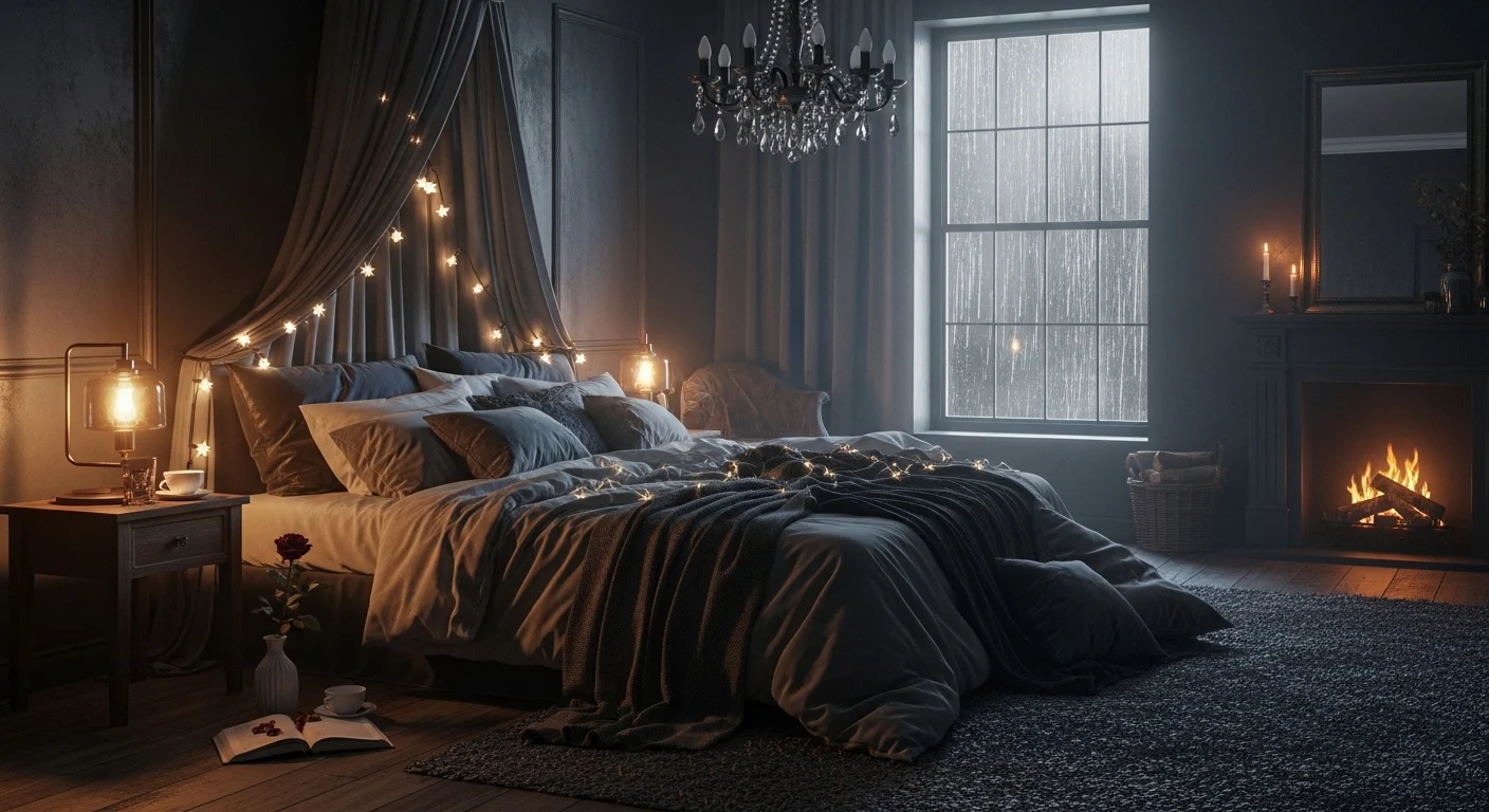 Romantic moods thrive in dark spaces. Soft lighting enhances intimacy. Rich colors feel luxurious. Fabrics add softness. The room feels cozy and dramatic. Romance feels natural.