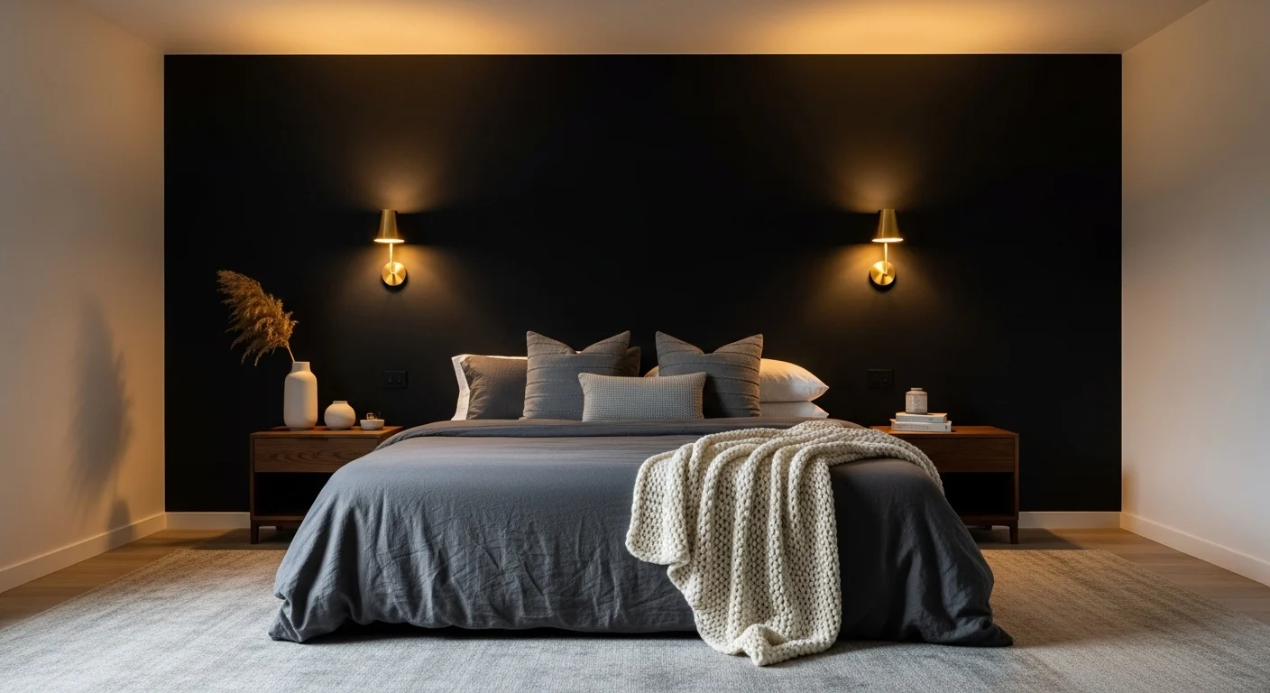Pairing black with soft lighting prevents harshness. Neutral furniture balances the darkness. Textured fabrics add comfort. Wood tones warm the space. Minimal wall art keeps focus on the wall. The room feels bold and sophisticated.