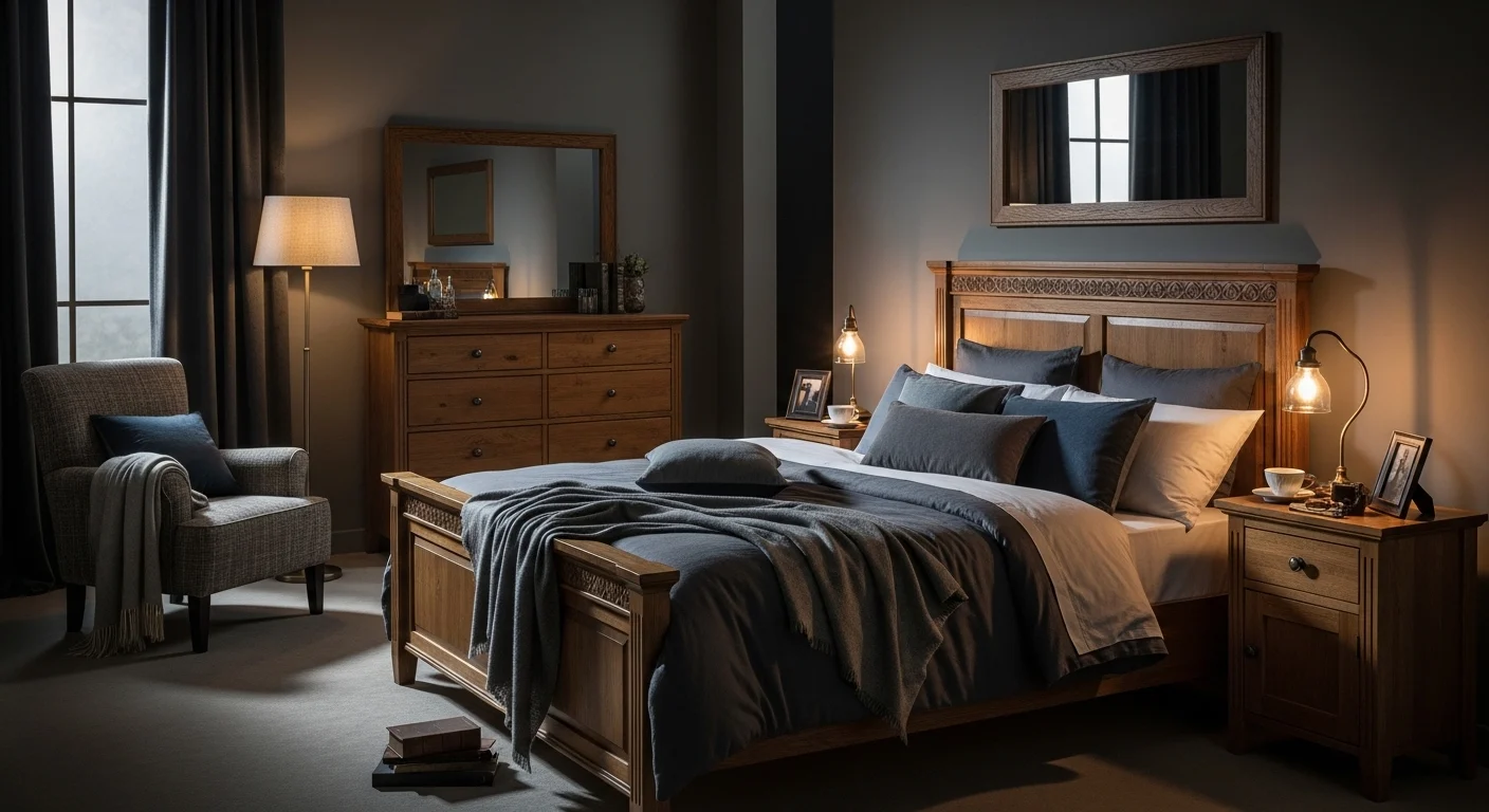 Layered textiles add comfort. Soft rugs warm floors. Lamps create gentle glow. Neutral accents soften darkness. Furniture feels inviting. The bedroom becomes a retreat.