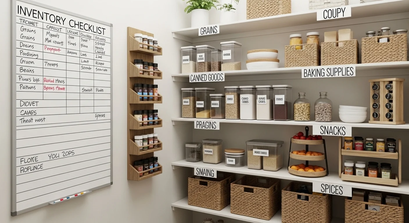 Organized pantry featuring inventory checklist board for smart food tracking.
