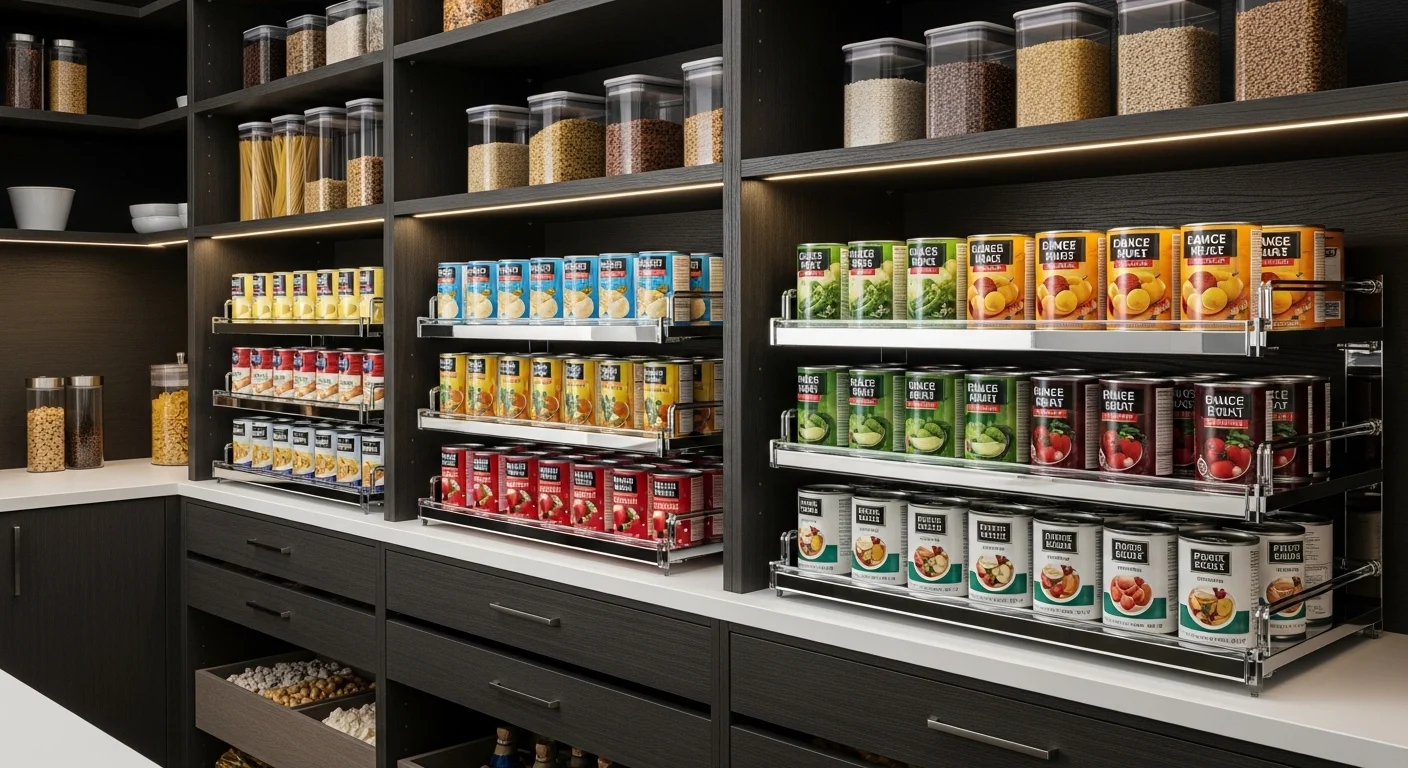Stackable racks keep canned goods visible and prevent rolling or overcrowding. They maximize shelf depth efficiently.