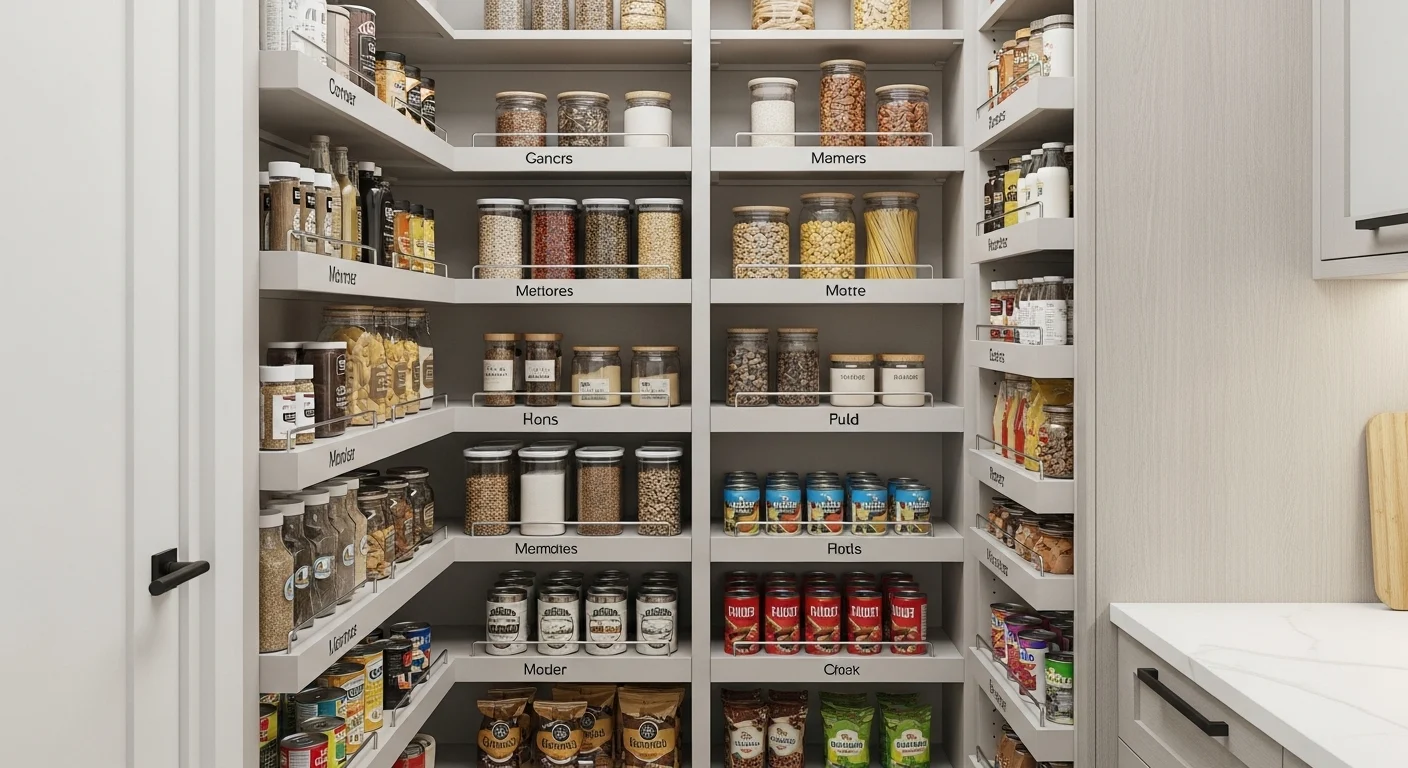 Pantry organized with frequently used items placed at eye level for efficiency.