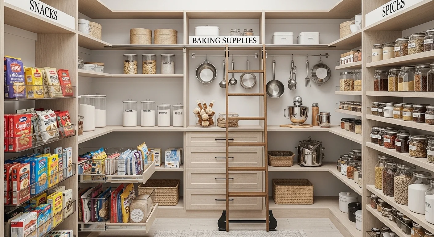 Placing frequently used items at eye level improves efficiency and keeps the pantry naturally organized. Less-used items stay higher or lower, creating a logical system that lasts long term.