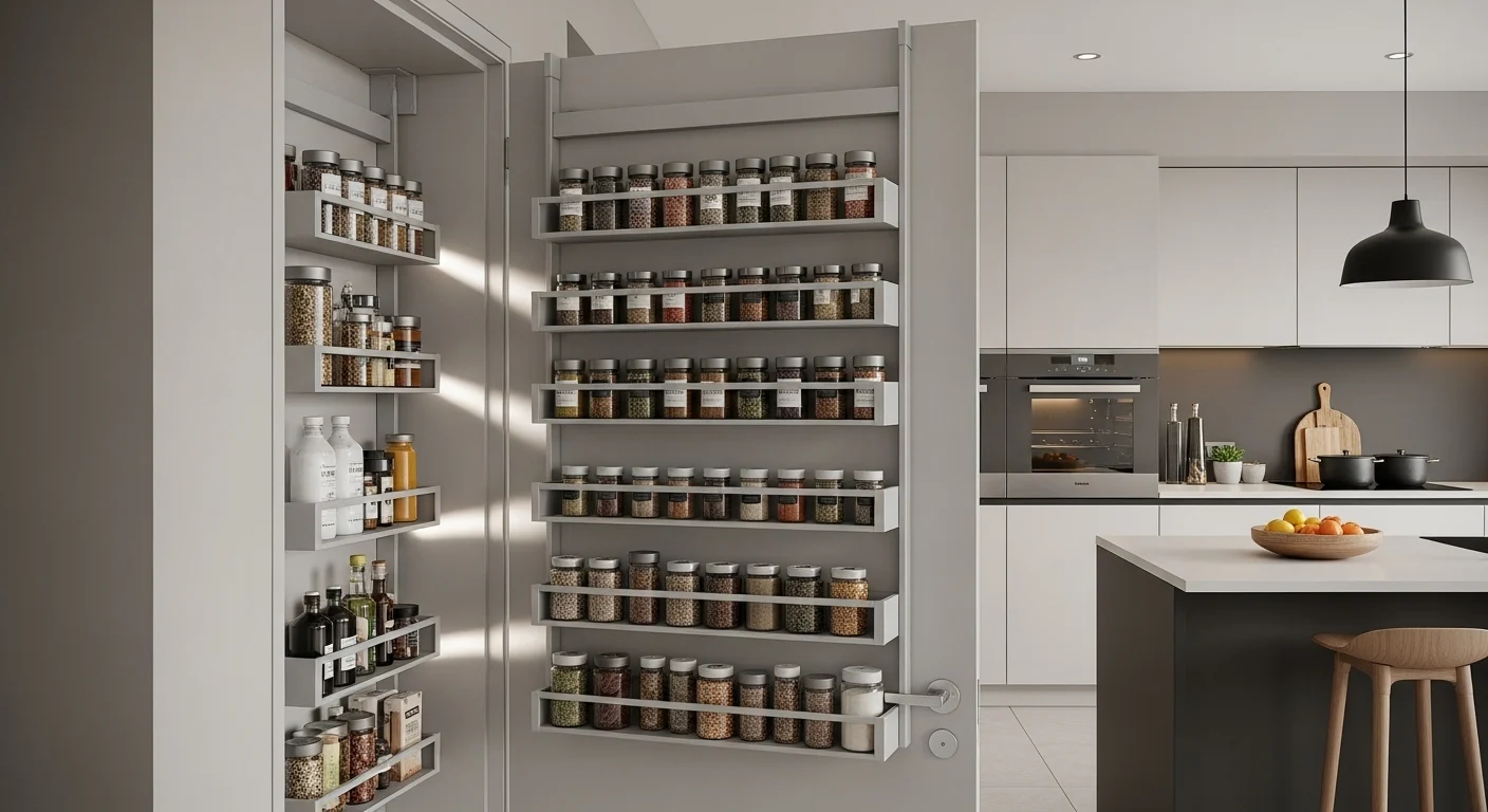 Pantry door mounted racks storing spices and small kitchen items efficiently.