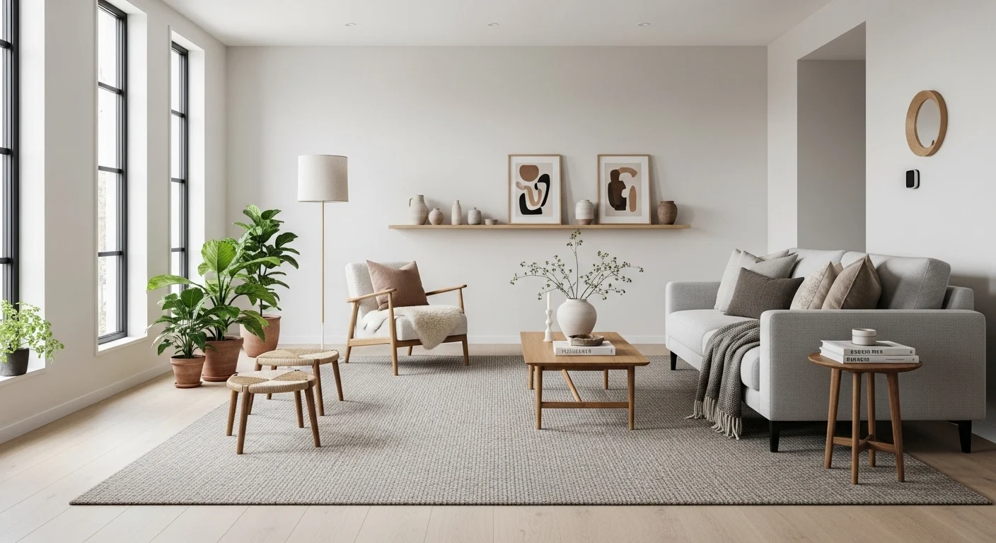 Area rugs define seating zones while adding warmth underfoot. Wool or textured rugs enhance comfort and visually anchor furniture.