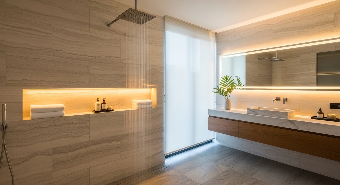 Storage solutions are essential in 2026 bathrooms. Built-in niches keep products organized. They eliminate bulky shelves. The wall integration looks clean and modern. It improves usability. It also adds design detail.