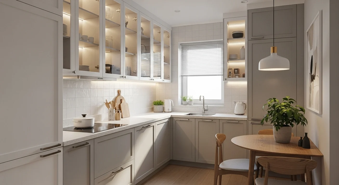 Glass-front cabinets reduce visual heaviness compared to solid doors. They create openness while still offering storage, making them perfect for compact kitchens.