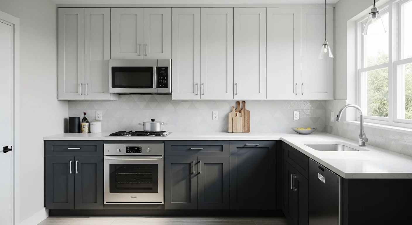 Using two complementary cabinet colors adds dimension without overwhelming a small kitchen. Light upper cabinets paired with darker lower cabinets ground the design while keeping the space airy.