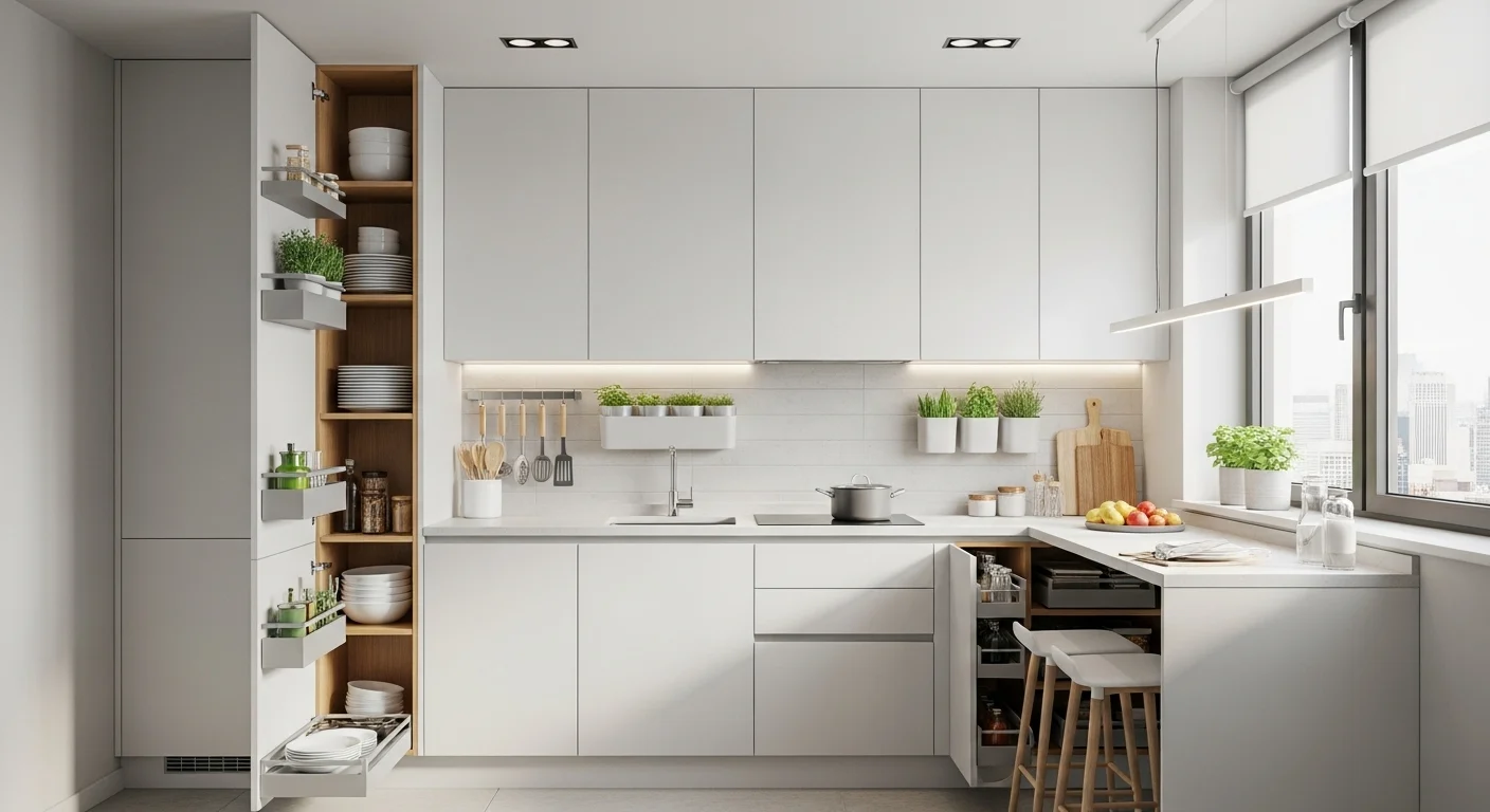 Corners are often wasted in small kitchens, but smart solutions like pull-out drawers, rotating shelves, and corner cabinets make every inch useful. These hidden systems improve accessibility while keeping the layout organized and efficient.