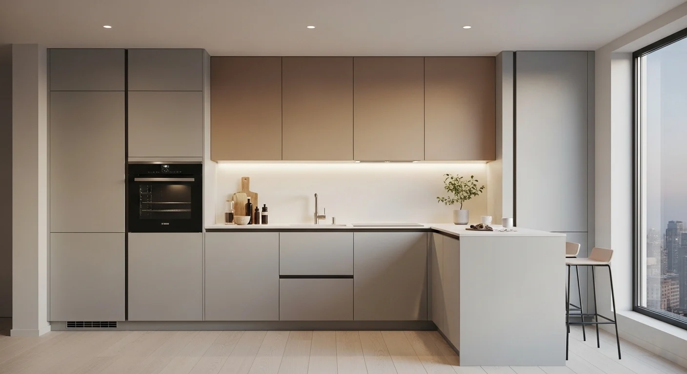 Light colors instantly make small kitchens feel larger and more open. Shades like soft white, warm beige, and light grey reflect natural light and reduce visual heaviness. In 2026, designers are choosing warm neutrals instead of stark whites to create a welcoming atmosphere while maintaining brightness. Minimal contrast keeps the space visually clean and uncluttered.