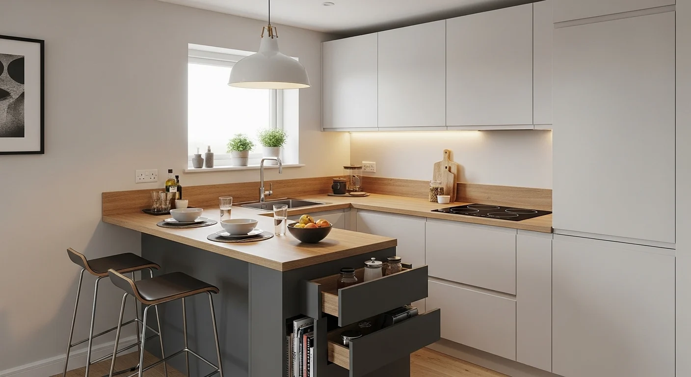A narrow breakfast bar creates casual dining without needing a full table. It works perfectly in small open-plan homes.