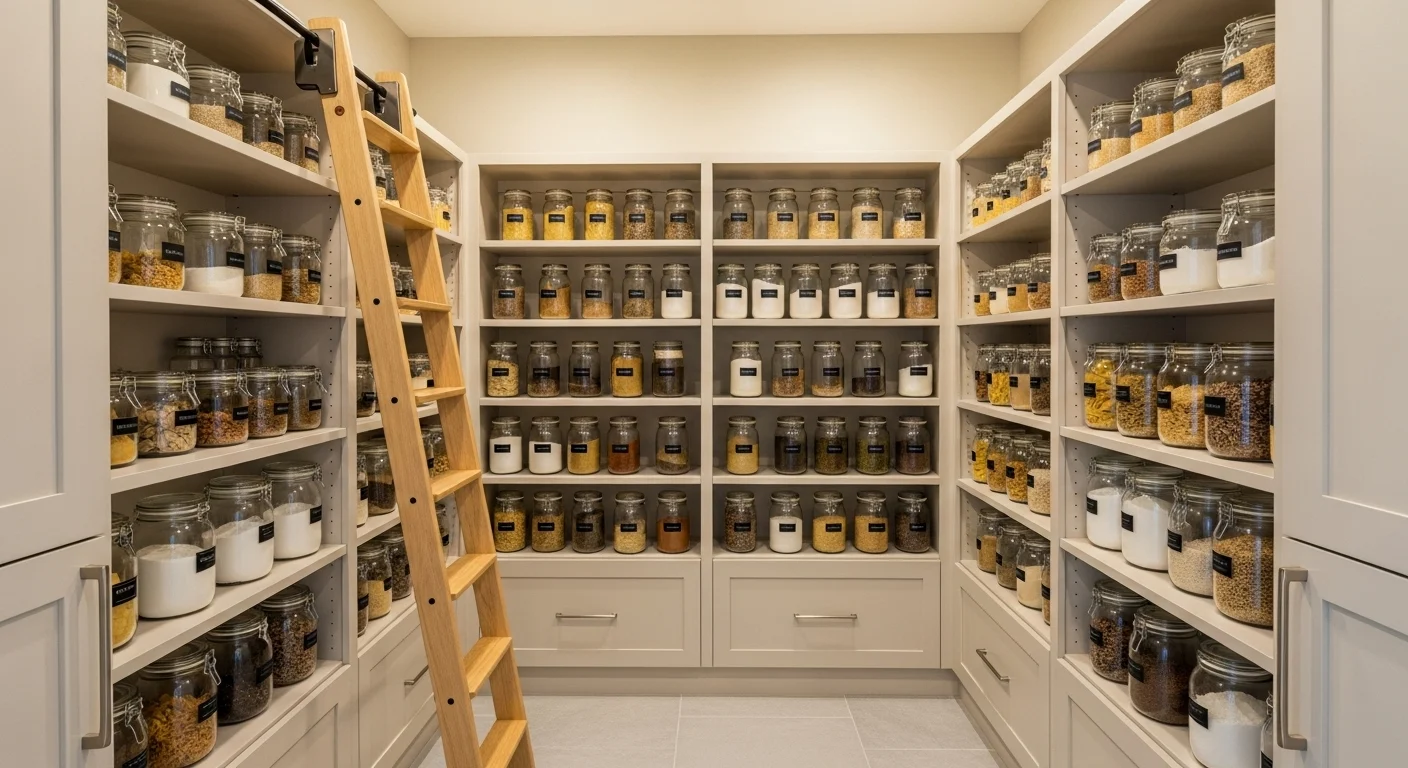 Using the full height of the wall maximizes storage instantly. Floor-to-ceiling shelves allow you to store rarely used items higher up. This keeps everyday essentials within easy reach. Visual clutter is reduced by organized vertical storage. The pantry feels taller and more efficient. Light colors prevent heaviness. This approach is ideal for 2026 small homes.