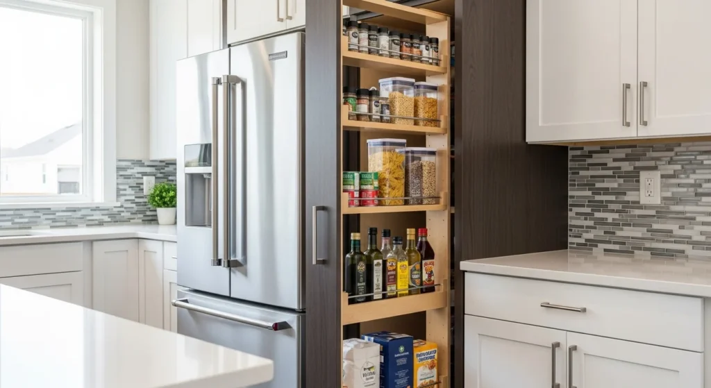 Pull-out pantries make use of tight gaps. They slide out smoothly for full visibility. Nothing gets lost at the back. This design improves accessibility. Storage stays compact and organized. Perfect for small kitchens. A must-have in 2026 layouts.