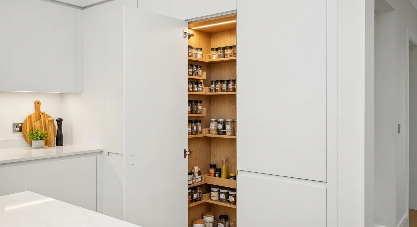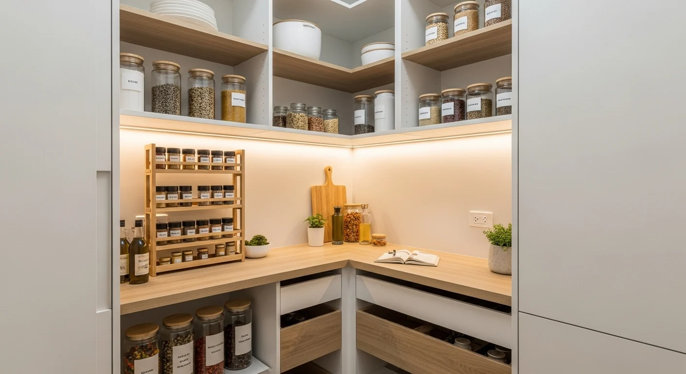 Corner spaces are often underused. A corner pantry maximizes awkward layouts. Rotating or angled shelves improve access. Storage becomes efficient. No space is wasted. The pantry feels intentional. Ideal for compact kitchens.
