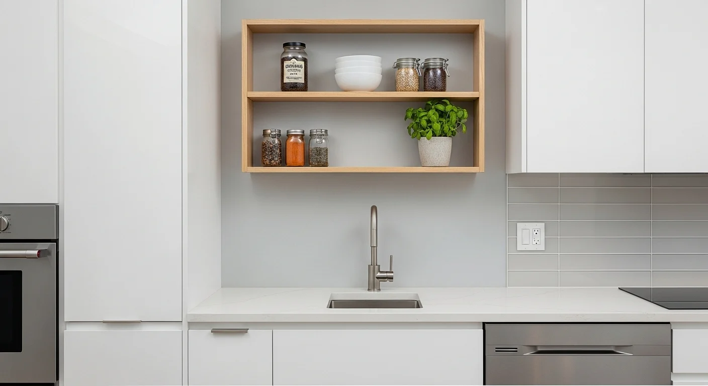 Wall-mounted pantries save floor space. Shelves stay lightweight visually. Storage floats above ground. This keeps the area open. Ideal for very small kitchens. Organization stays efficient. Minimalist and modern.
