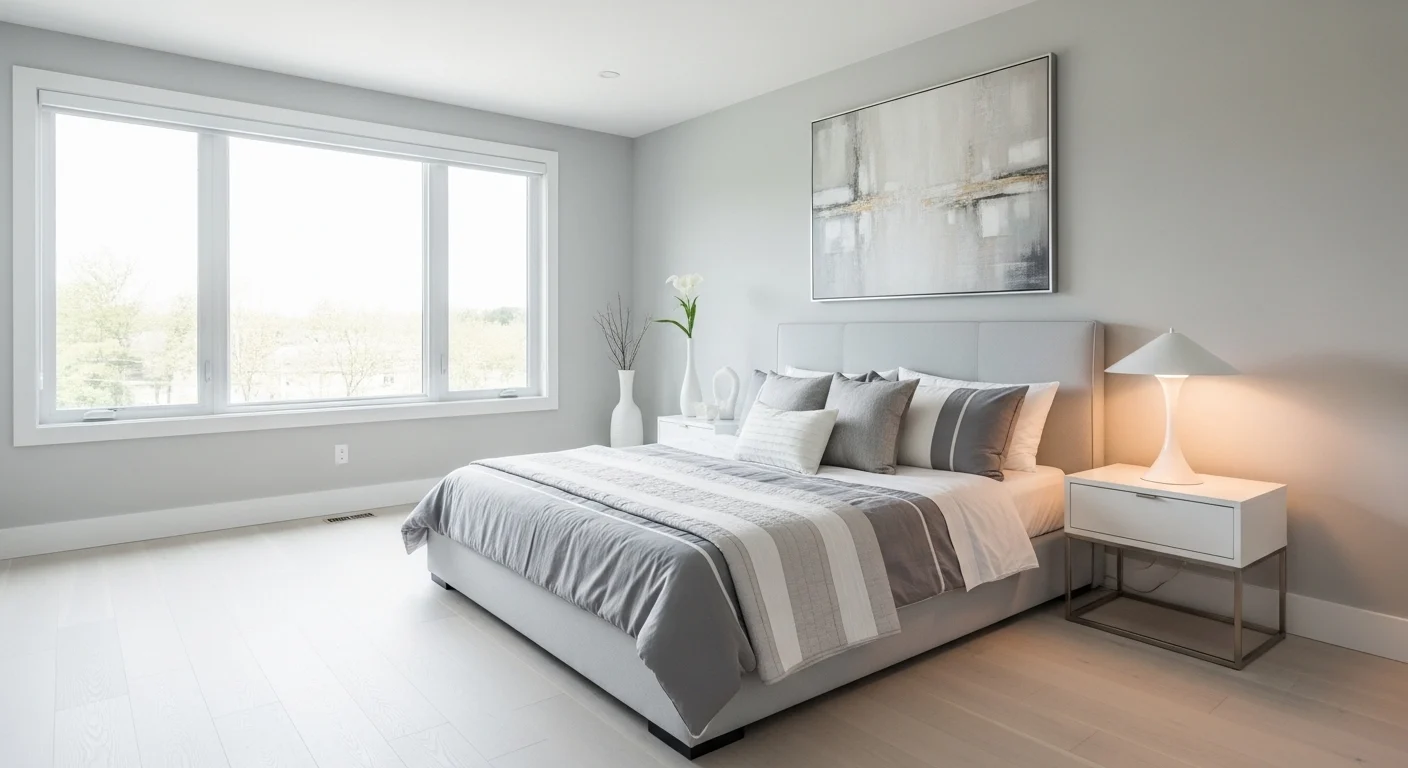 Adding white bedding enhances brightness. Minimal furniture keeps the room uncluttered. Subtle textures like linen and cotton add warmth. Wood accents balance the cool tone of gray. Soft lighting completes the serene vibe. This style is ideal for a relaxing retreat.