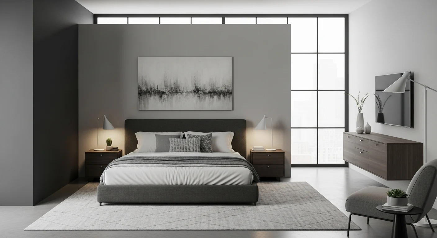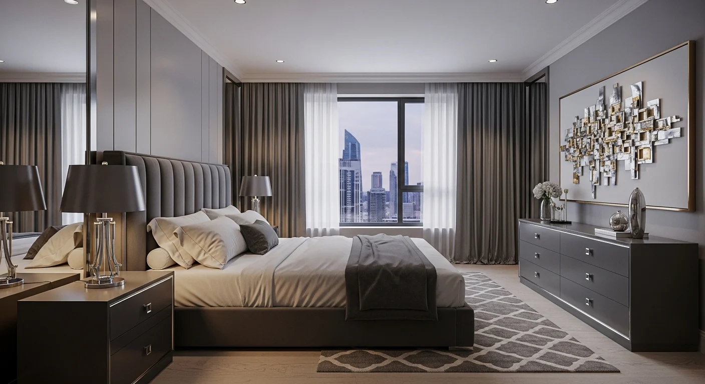 Sleek furniture adds polish. Neutral bedding balances tones. Lighting remains subtle. Decor is intentional. Gray walls feel modern. The room feels fresh.