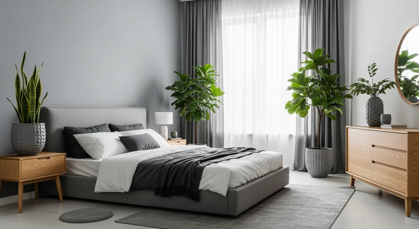 Greenery adds freshness. Wood furniture enhances warmth. Gray walls remain calm. Soft lighting completes the look. Minimal decor maintains focus. The bedroom feels refreshing.