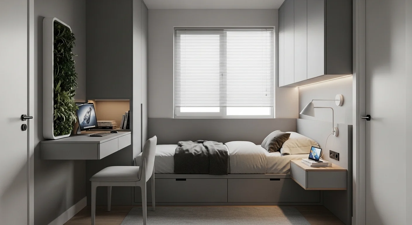 Floating furniture saves space. Mirrors reflect light. Soft tones enhance openness. Storage stays hidden. Lighting remains subtle. The room feels bigger.